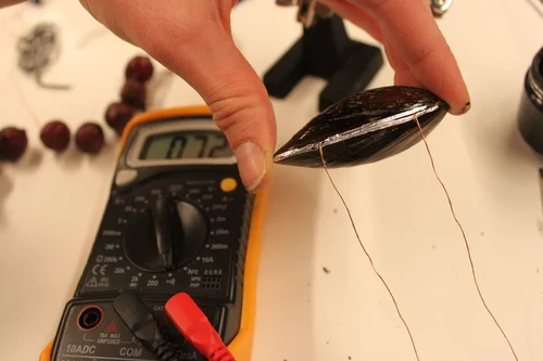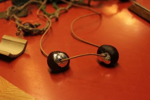In Figures 3, 4 there are explorations on crafting simple input senosrs, such as buttons, switches or potentiometers from fragile and organic materials picked direcly from nature (e.g. seashells, nuts, dried leaves). This was party explored during the workshop I co-organized at TEI'14 conference in Munich at 2014, with the title 'Handcrafting Electronic Accessories Using 'Raw' Materials' and partly during the 'Precious Materials of Interaction' project, together with the silversmith Stockholm-based artist Emma Rapp and my supervisor Ylva Fernaeus. In Figure 5 there are conductive threads of various kind, shielded off with glass beads.